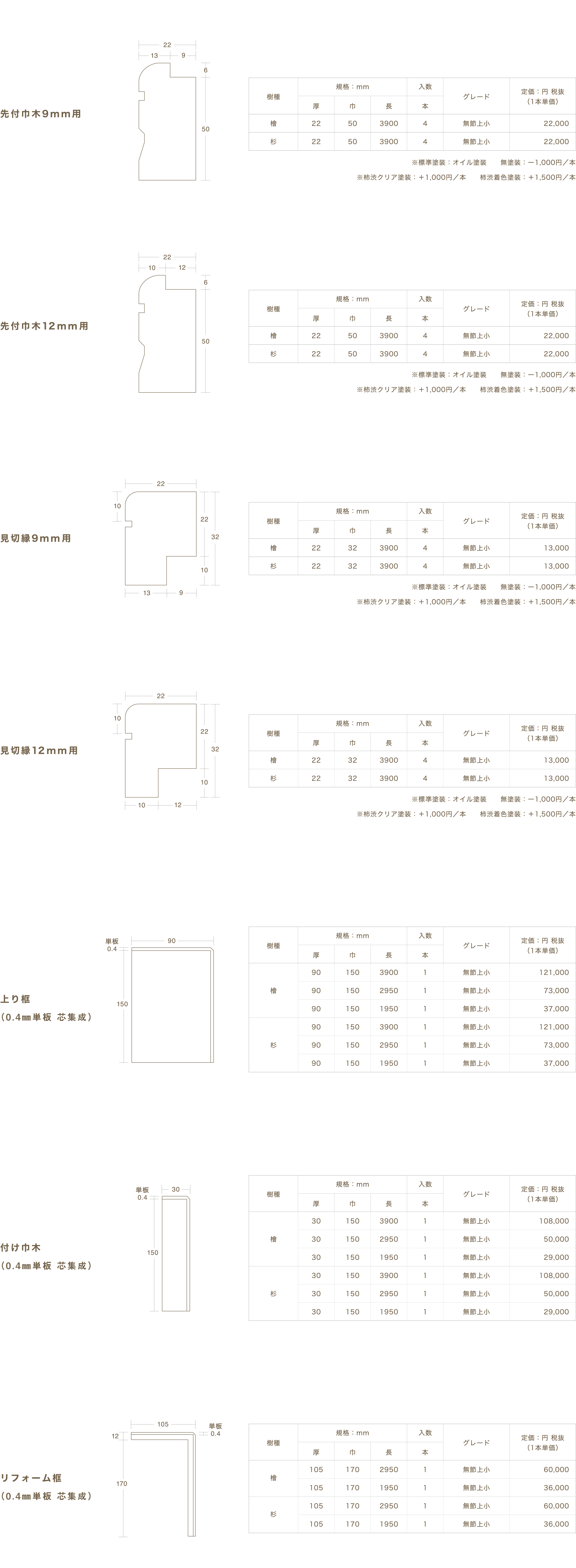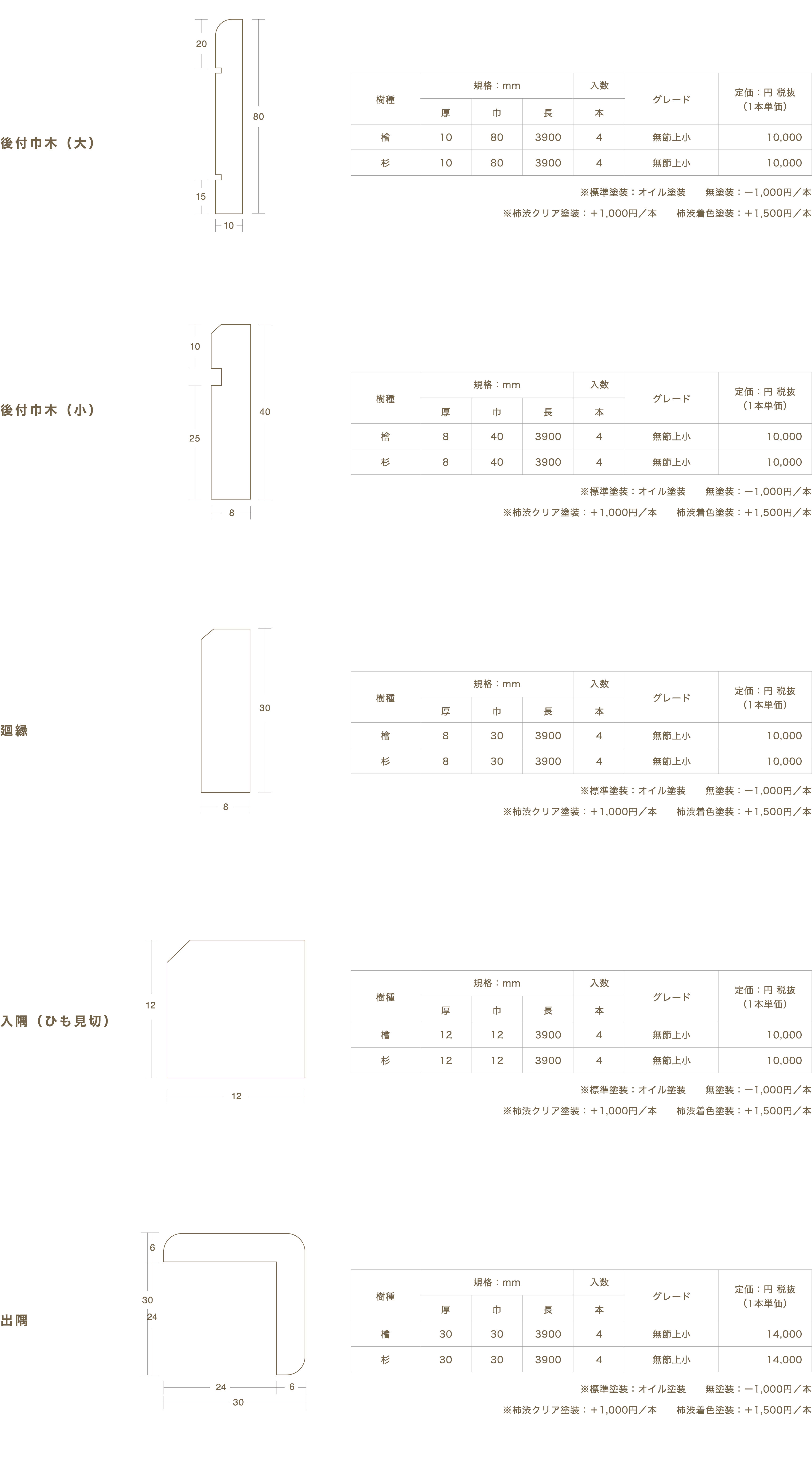 床材や壁材とともに空間を整える造作材を取り揃えています。空間全体の統一感を高めるため、同材質・同色で揃えることができ、柿渋塗装や各種カラー塗装にも対応可能です。床・壁材と合わせて一括でご注文いただくことで、現場での調和が図りやすく、仕上がりもより美しくなります。