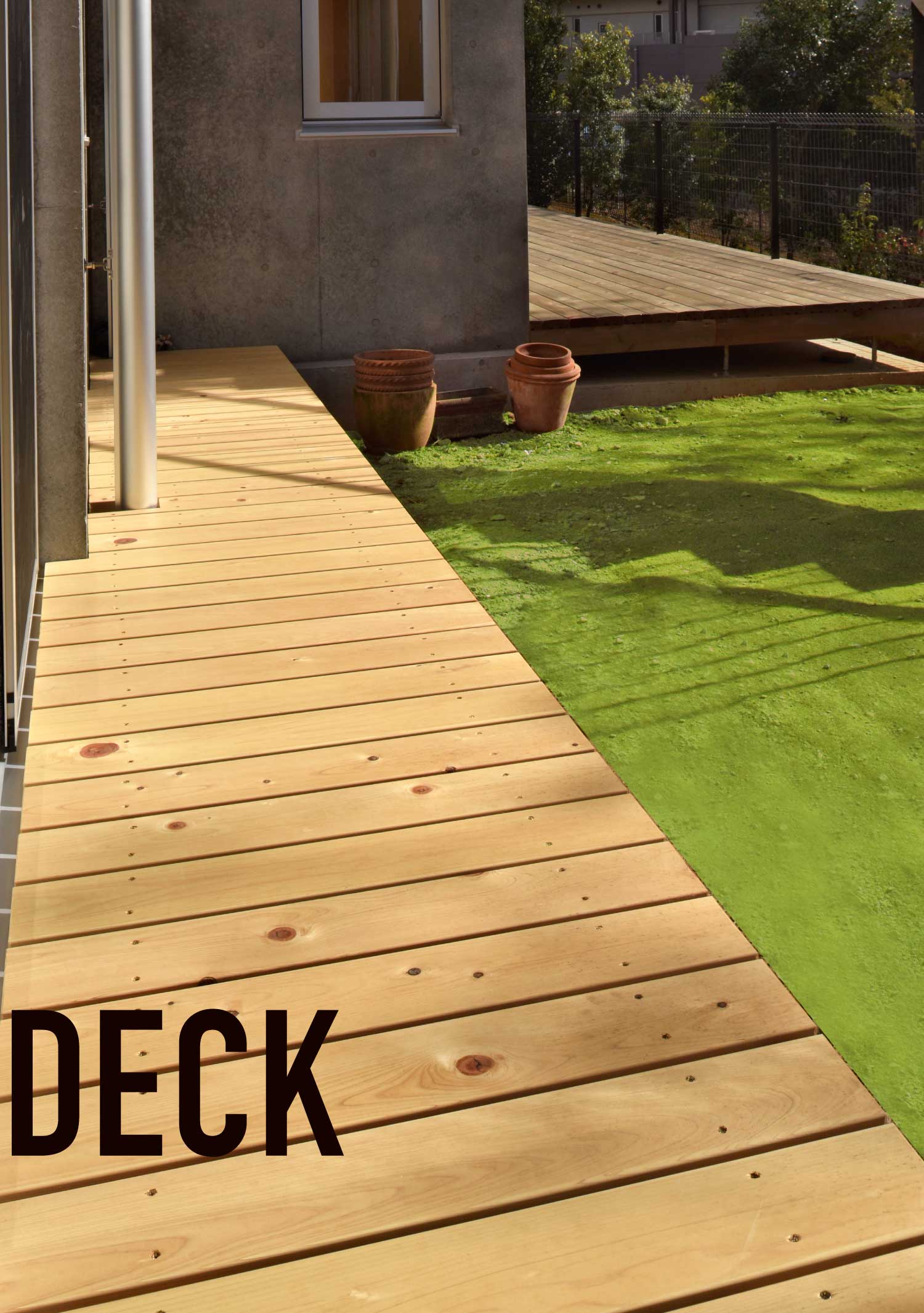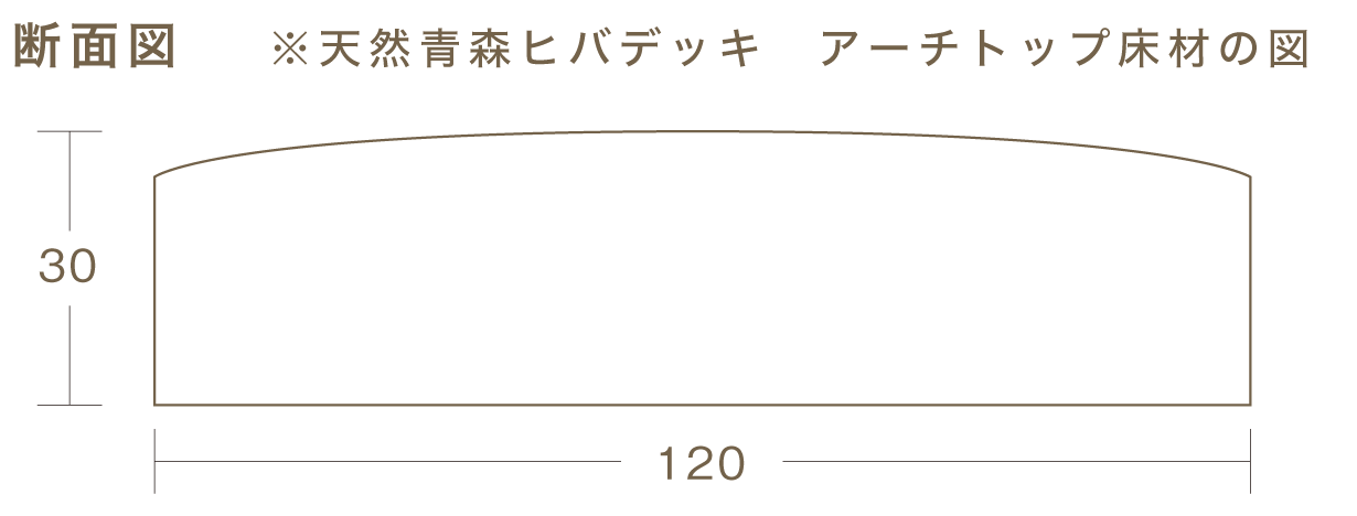 住宅 非住宅 新築 リノベーション デッキ材(天然青森ヒバ) 部材:デッキ材 樹種:樹種:青森ヒバ|無垢 青森ヒバは、清潔感のある明るい材色と心地よい芳香を備え、経年によって風合いを深めることで高い意匠性を発揮します。心材に含まれる天然成分によって抗菌・防虫・消臭性を示し、薬剤処理をせずとも屋外条件下で長期耐久性を確保可能。さらに、デッキ面にはアーチ形状を設け、自然な排水性を持たせることで美観と耐用性を両立させています。